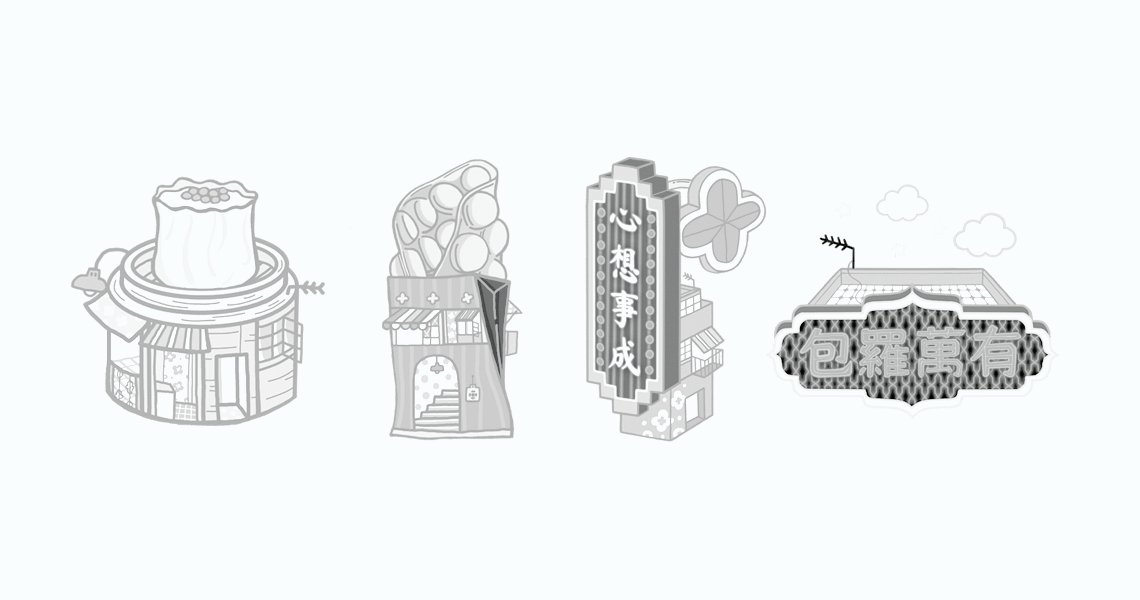 四幅插圖均與香港文化和美食特色有關,將不同元素與唐樓的圖案結合在一起,產生可愛的畫作。 The four illustrations are all related to Hong Kong culture and culinary specialties, combining various elements with tenement building patterns to create charming artwork.